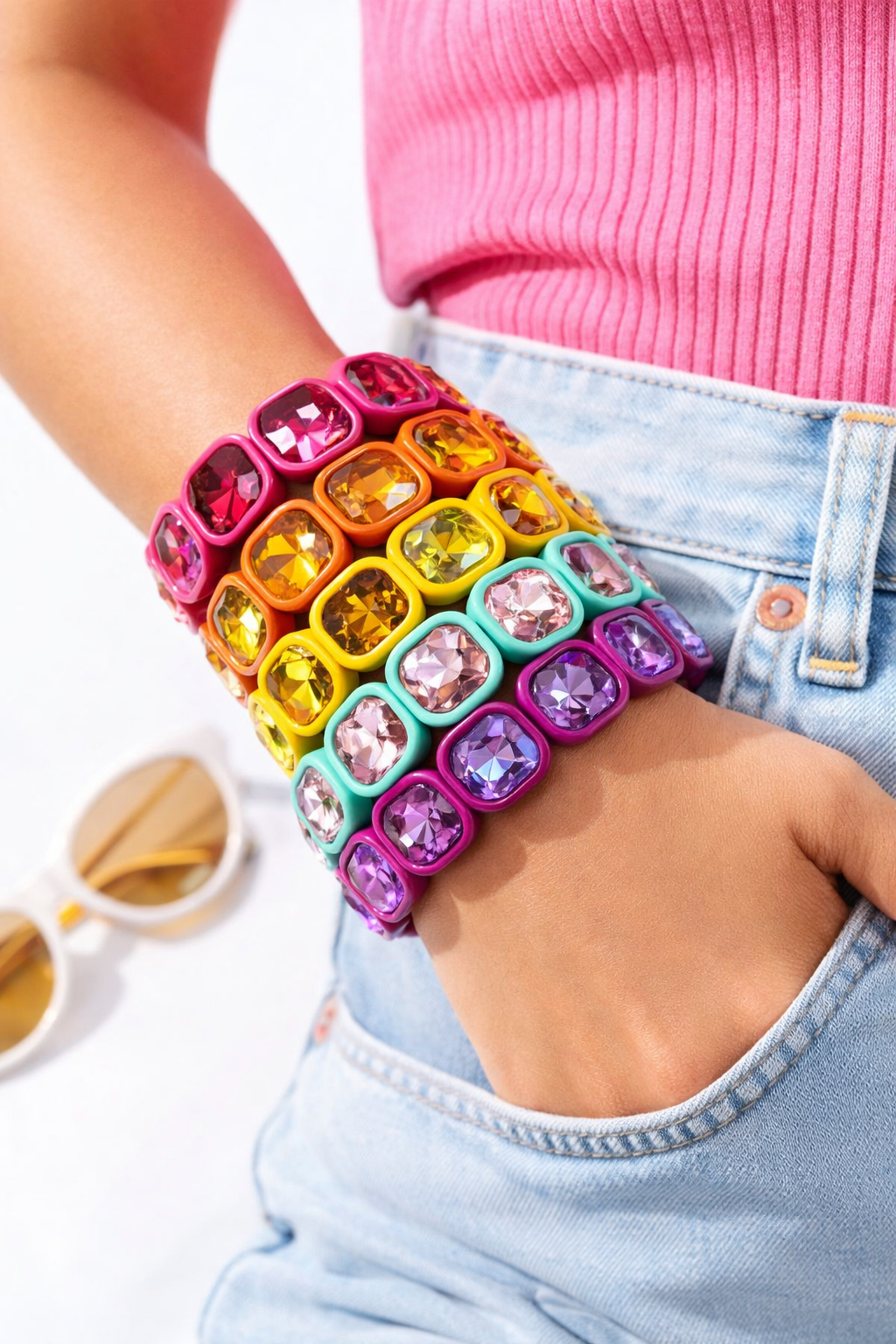 These are Enamel Stretch Bracelets, often referred to as “Candy” or “Elise” bracelets due to their vibrant colors and chunky, gem-set design. They are characterized by geometric enamel beads, typically around 15mm, set with large, light-catching crystals or rhinestones.