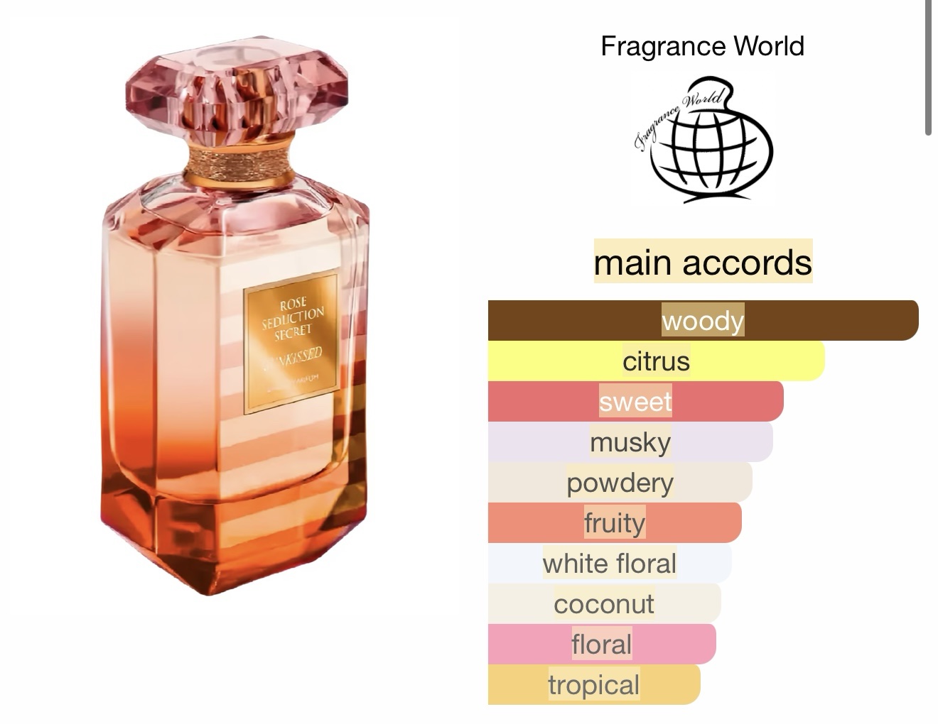 This is a bottle of Fragrance World Rose Seduction Secret Sunkissed Eau De Parfum.