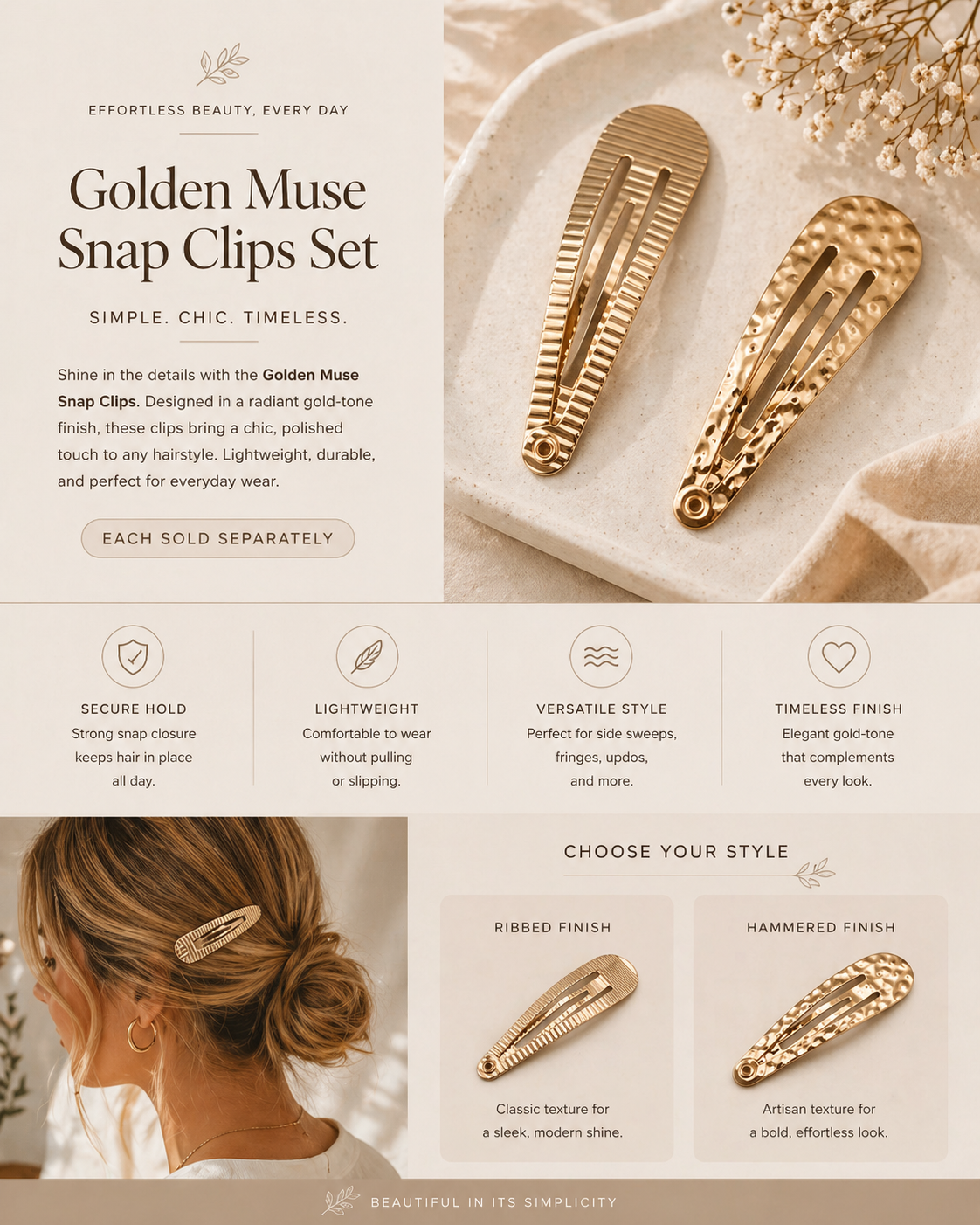 Elevate your everyday hairstyle with the Golden Muse Snap Clips – where timeless elegance meets modern simplicity. Designed in a radiant gold-tone finish, these chic snap clips add the perfect polished touch to any look. Available in two unique styles: a sleek ribbed texture for classic shine, and a hammered finish for an artisanal statement.